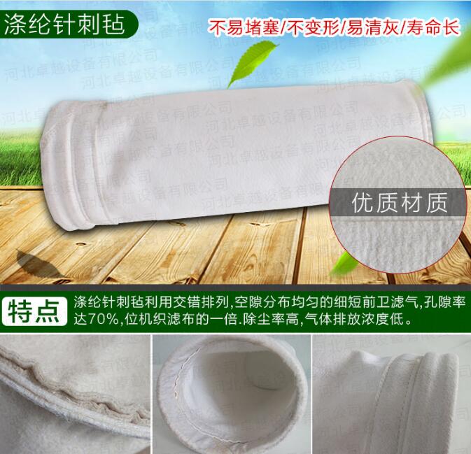 抗水防油滌綸針刺氈除塵布袋是針刺尼利用疏水劑和疏油劑經浸軋,預烘,焙烘處理而形成的.疏水劑和疏油劑經迅速烘干后,以圓狀包附于濾料纖維的表面,從而減少了水和油與濾袋的表面張力,這樣水,油和粉塵形成的濕性過濾介質_不會粘附于濾袋的表面,從而避免了糊袋現象.拒水防油針刺尼通常是在除塵器箱體溫度低于露點溫度,含塵氣體的濕度又較大的情況下使用.